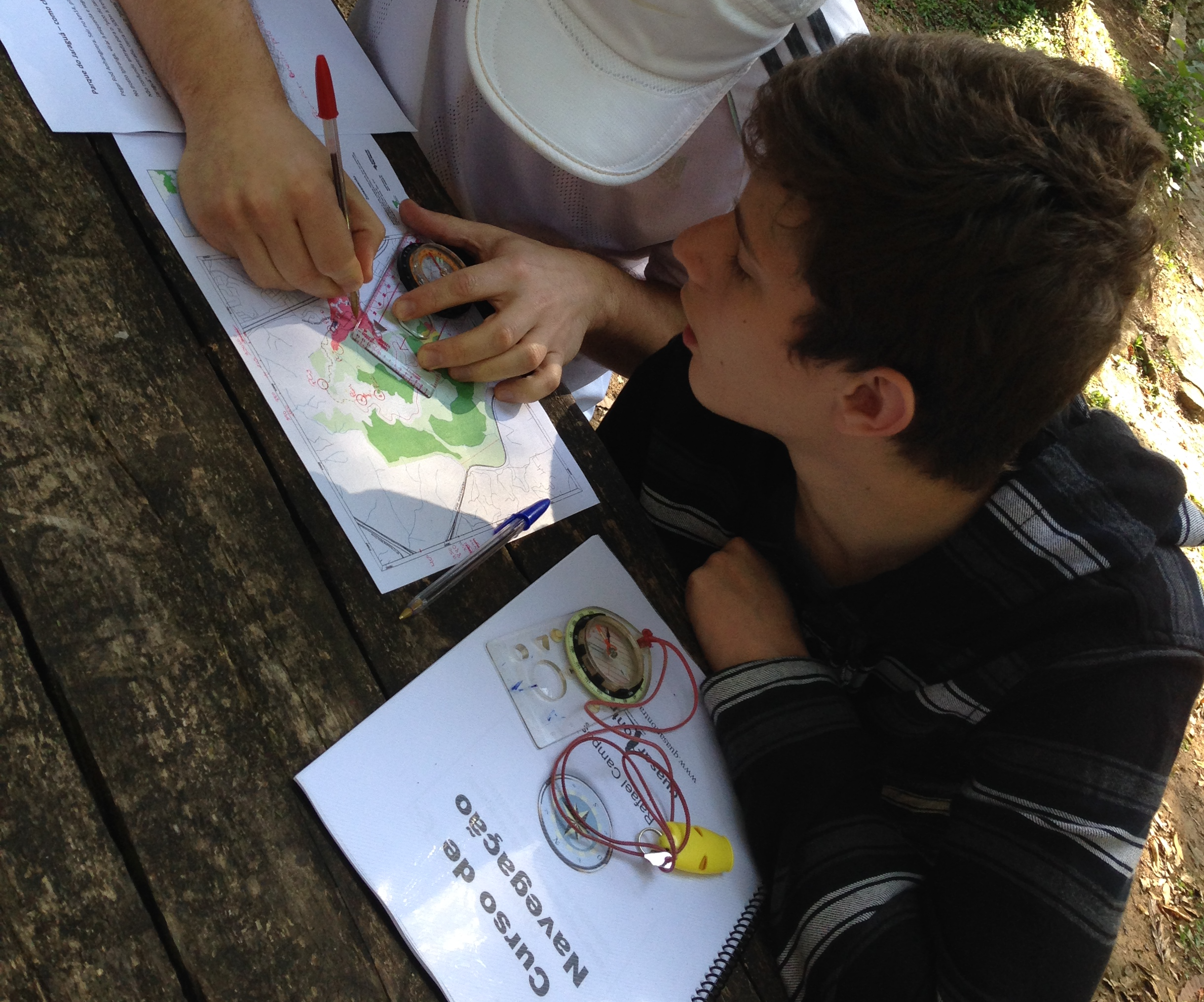 aberto, serão abordados conceitos básicos de orientação conforme conteúdo abaixo, combinado com exercício práticos para aprendizagem. Na sequencia os alunos divididos em equipes deverão realizar uma pista de azimute para colocar em prática os conceitos passados. Posteriormente farão outra pista, esta mais desafiadora, que exigirá além da técnica e conceitos ensinados, comportamentos que poderão ser discutidos posteriormente ou explorados para outras vivências. de recursos para o jantar, ou acampamento, ou fogueira